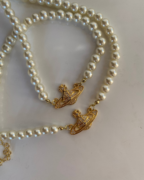 - Pearl necklace with crystal planet design